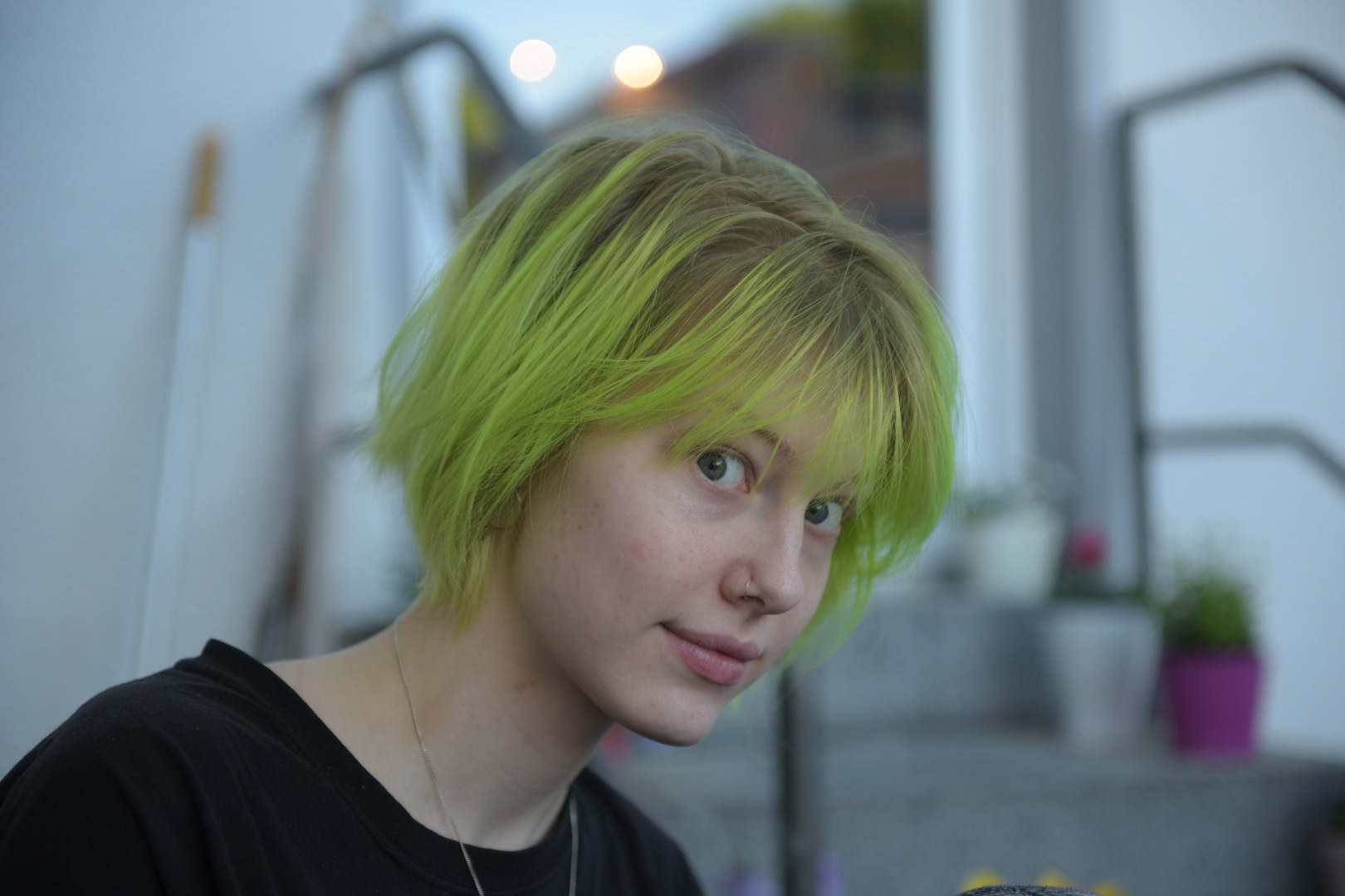 Meine Tochter mit selbst gefärbten Haaren und ohne Bearbeitung. Fast ein langweiliges Bild, mit wenig Licht einfach spontan fotografiert, irgendwie fad.