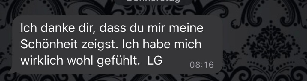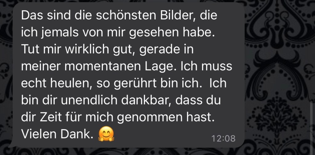Daher veröffentliche ich Referenzen. Es sind Nachrichten, die ich nach Shootings erhalten habe. Auf Anfrage kann ich gerne mehr zu dazu berichten, bzw. auch Kontakt zu den Personen herstellen, damit sich jeder überzeugen kann, wie professionell, vertrauensvoll und angenehm meine Shootings sind.